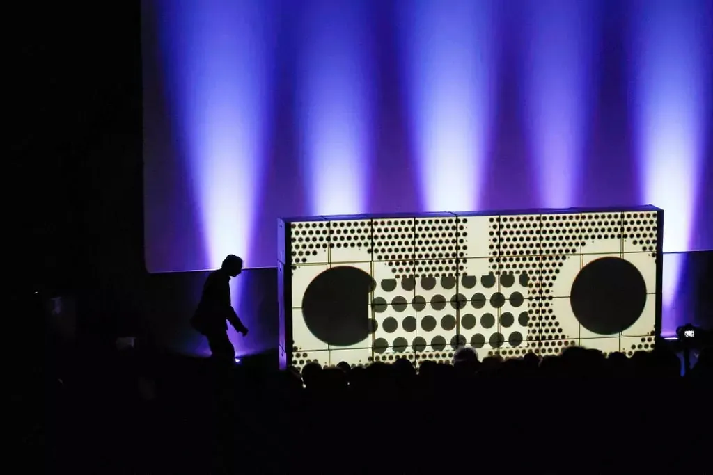 - Live video mapping was projected onto movable box structures repositioned by the artist during the performance.
