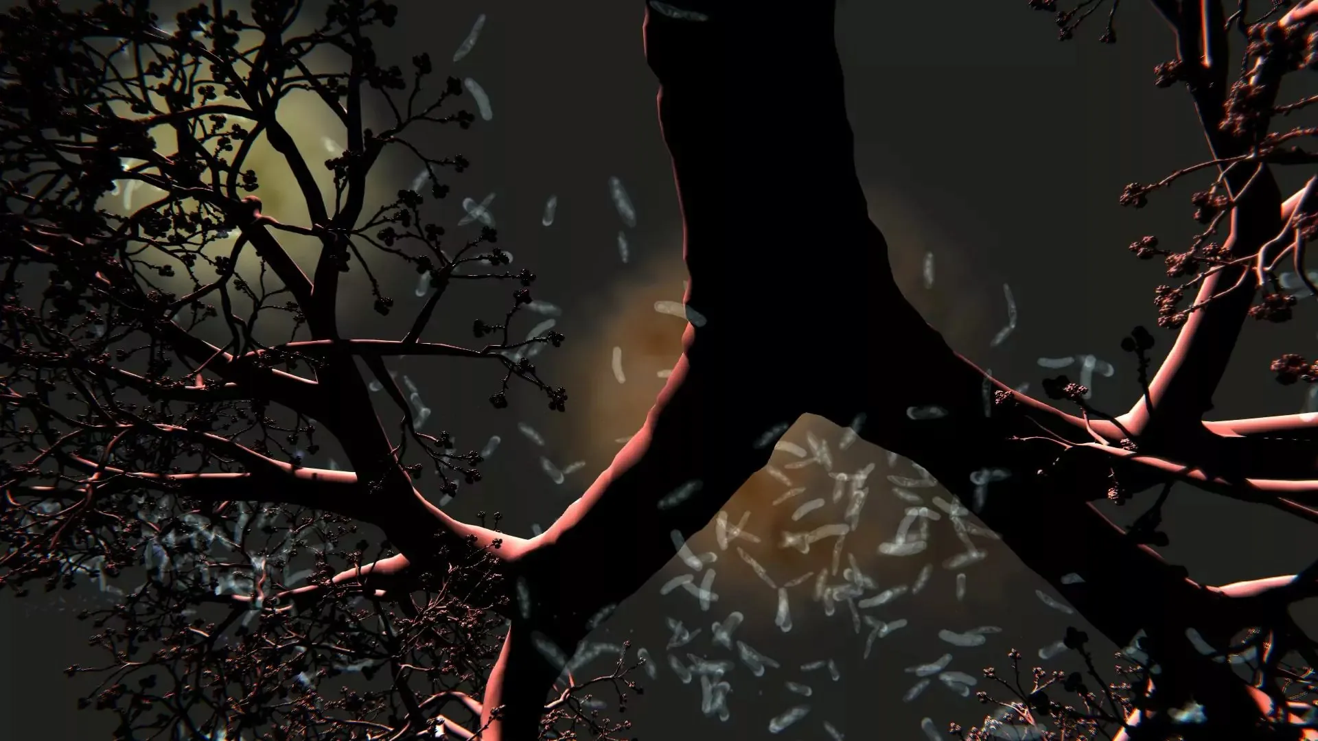 Alex May developed Susceptible with Anna Dumitriu as a data-driven interactive artwork and video work based on tuberculosis research from the CRyPTIC consortium led by the University of Oxford. The work transforms genomic and imaging data from 10,290 tuberculosis samples into a moving environment shaped like the bronchi and alveoli of the lung, where bacterial swarms interact with coloured antibiotic clouds and with the bodies of visitors. Rather than presenting scientific data as something distant or abstract, the project turns it into a sensory encounter with infection, treatment, and uncertainty.