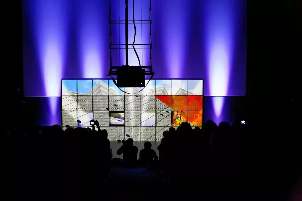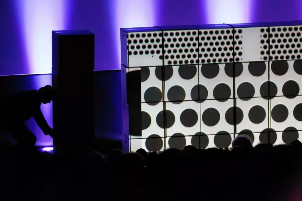 - Live video mapping was projected onto movable box structures repositioned by the artist during the performance.